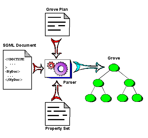 <- HyTime Engine -> <- Grove Constructor -> <- Grove Plan -> <- SGML Property Set -> <- Semantic Grove -> Groves are said to be "constructed" by grove constructors according to a grove plan . Grove constructors are processors that take as input either the result of parsing data or another grove or groves and produce a new grove. For SGML, the input to a grove constructor would be the output of an SGML parser and the output would be an SGML document grove as defined by the SGML property set . For HyTime, the input to a grove constructor would be one or more SGML document groves and the output would be a HyTime semantic grove as defined by the HyTime property set . In a real system parsers and grove constructors may be bound together. For other types of processors, such as HyTime engines , grove construction is simply part of what they do. Figure 2 shows the construction of an SGML document grove.